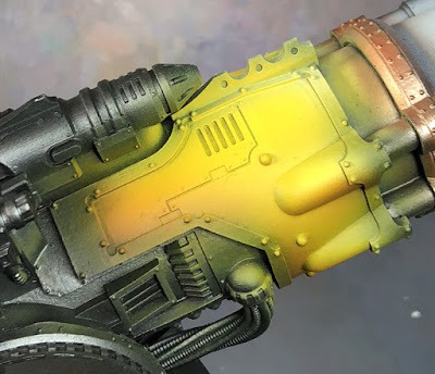 La peinture commence ensuite, pièce par pièce, je veux faire un titan du gryphonicus (avec variante), je décide donc de partir sur un bleu/jaune avec des touches de blanc (léger).