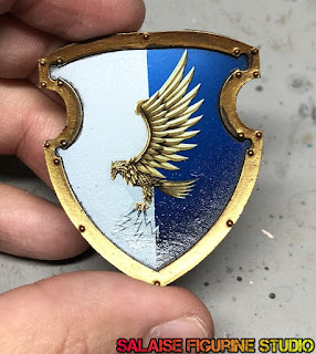 Après vernis brillant sur l'ensemble des pièces en vues de weathering, je vais poser des decals sur certaines parties de l'armure, pour casser la monotonie des grandes surfaces :